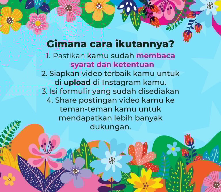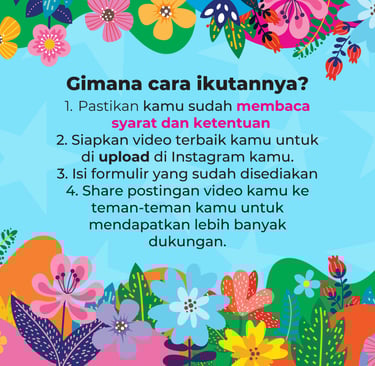 Mengisi form (https://forms.gle/sMP3ePyNpaN8Sija6) dengan jelas dan benar. Mengunggah 2 persyaratan, yaitu: link video dari instagram kamu dan 3 buah foto dengan ketentuan seperti tertera di bawah. Sebelum mengunggah 3 foto di formulir, pastikan rename file foto kamu dengan nama lengkap.